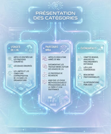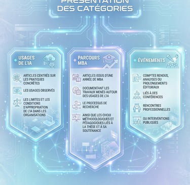 Articles issus d’une année de MBA, documentant les travaux menés autour des usages de l’IA, le processus de recherche, ainsi que les choix méthodologiques et pédagogiques liés à la thèse et à sa soutenance.
